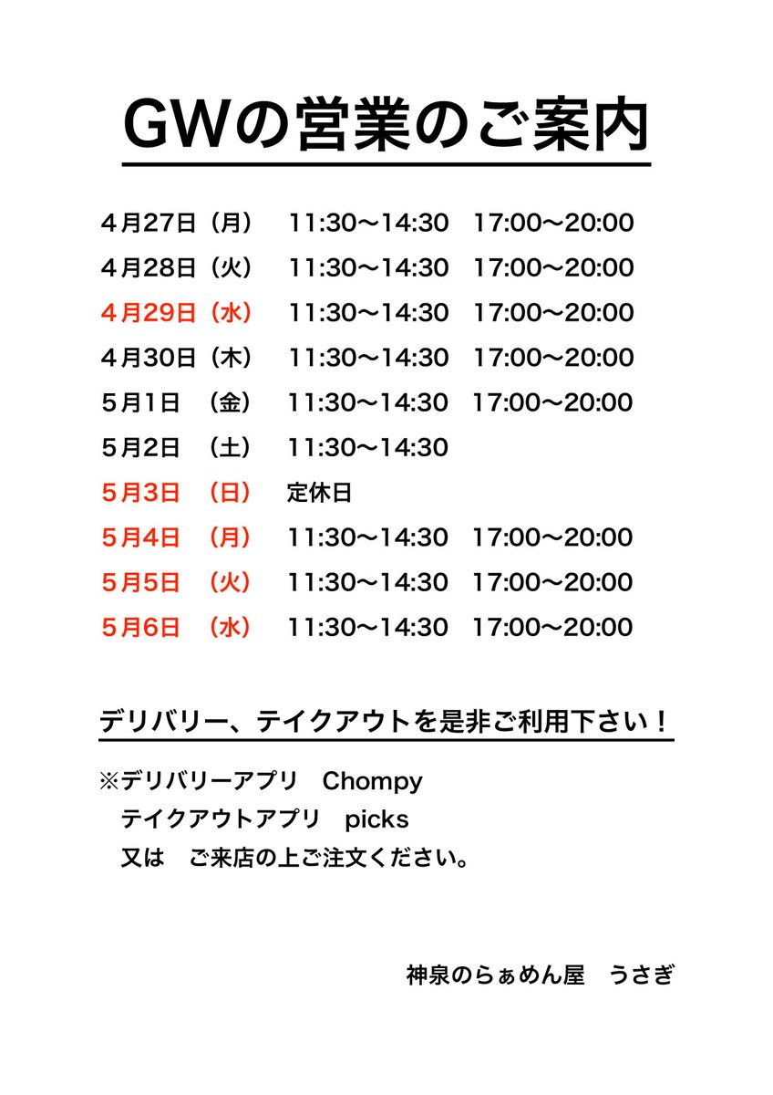 ট ইট র 神泉のらぁめん屋 うさぎ Gwの営業のご案内 Gw