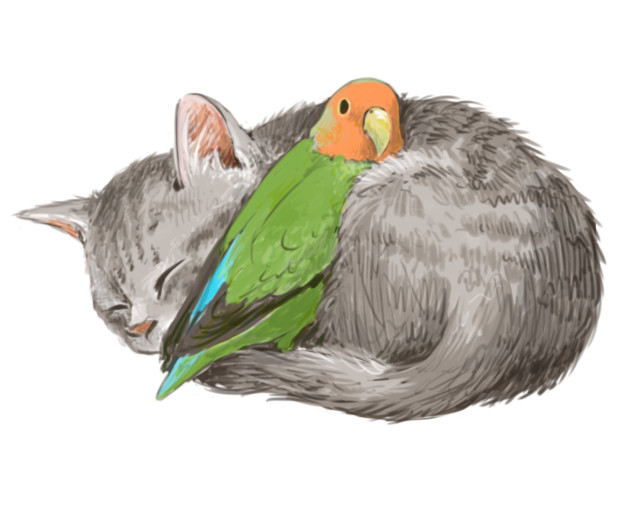 にゃんこと文鳥ちゃんを描きました ねこ 文鳥 イラスト 絵 猫