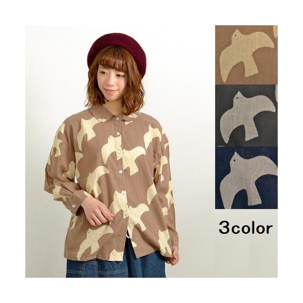 とりさん柄の丸襟シャツブラウス 長袖 レディース フリーサイズ 綿100