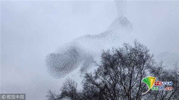 英国大群椋鸟空中飞舞鸟群形状千变万化令人称奇